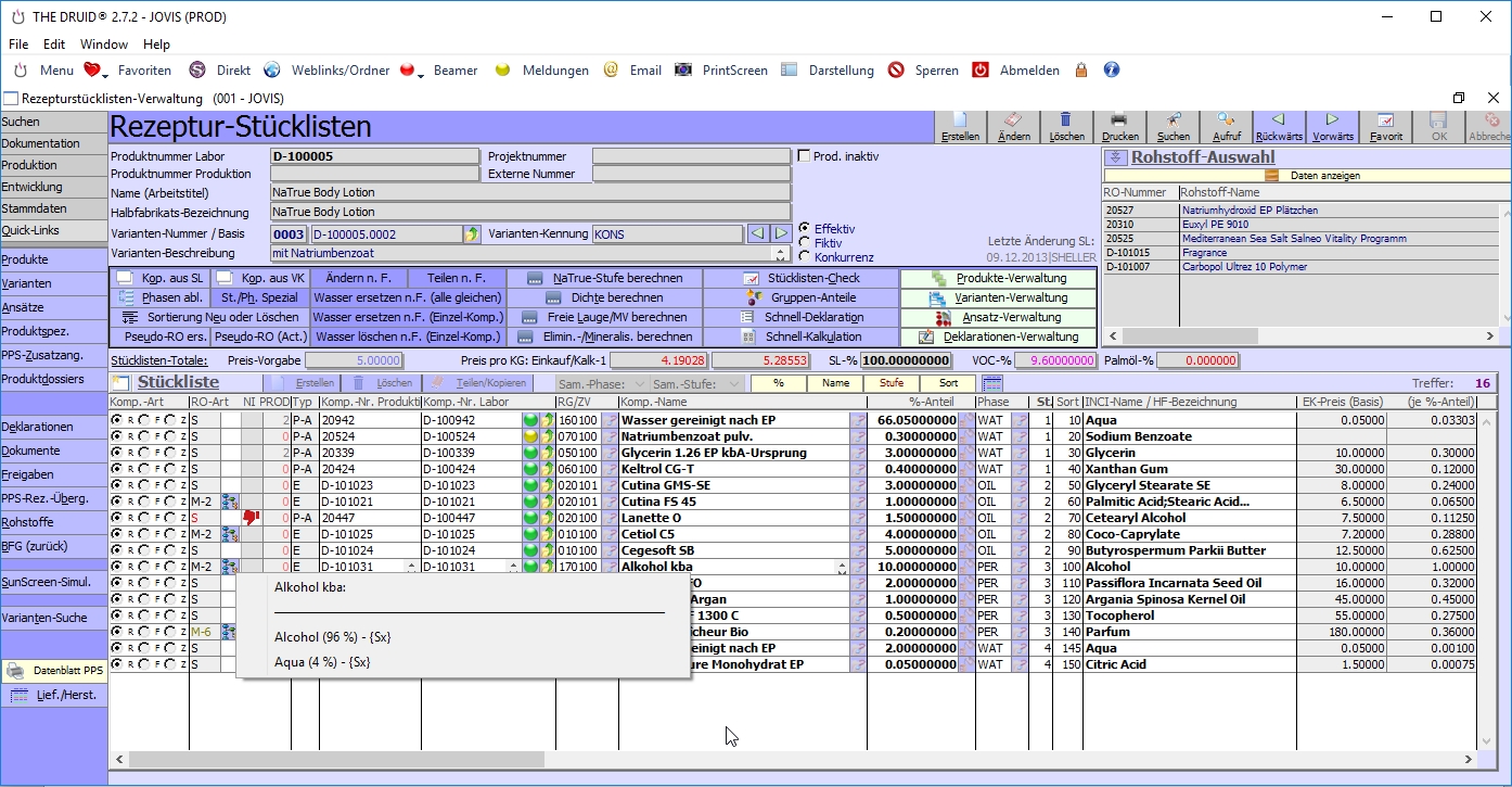 - Anzeige von Warnungen, Rezepturkosten, VOC, Palmölgehalt, Naturkosmetik-Label etc.