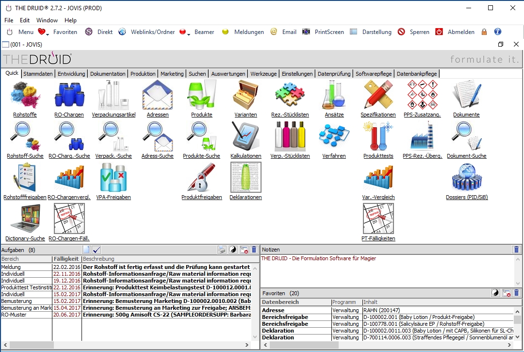 Die Formulation Software THE DRUID bildet den gesamten Prozess der Rezepturentwicklung ab. Sie gewährleistet die sichere Erfüllung der Regulatory Affairs und der Vorgaben der Kunden. Mit der integrierten Rohstoffdatenbank, der strukturierten Verwaltung der Dokumente und der Abbildung von laborspezifischen Informationen ist THE DRUID ein echter Allrounder: zuverlässig, sicher und angenehm im Umgang.